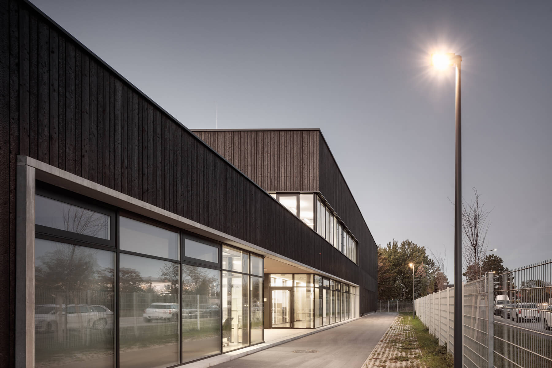 Die äußere Erscheinung wird geprägt durch die Baukörpergeometrie, mit einem nahezu würfelförmigen Kubus und geringem Öffnungsanteil an Fenstern. Die Geometrie wird durch eine einheitliche Oberflächengestaltung mit einer Verkleidung aus glatten, großformatigen Blechelementen unterstrichen. In Anlehnung an den Bestand wurde die Matierialtität, die Oberfläche und Farbigkeit der Fassadenverkleidungen aufgegriffen. Es entsteht ein lebendiges Spiel aus schmalen und breiten großformatigen Aluminium-Paneelen. Die horizontale Teilung spiegelt die Geschossigkeit des bestehenden Instituts wieder. Die nahezu geschlossene Struktur wird durch gezielte Einschnitte im Fassadenbereich der südlichen Hallenzufahrt für LKW`s und im nördlichen Bereich des Mitarbeitereingangs geöffnet. Die Fassade setzt an diesen Bereichen mit einem deutlichen farblichen Wechsel der Fassadenplatten einen Akzent. Der neue Baustein fügt sich somit selbstverständlich in das bestehende Gebäudeensemble ein und bewahrt dennoch einen individuellen, selbstbewussten Ausdruck, der den Charakter der Nutzung und deren Eigenständigkeit beschreibt.