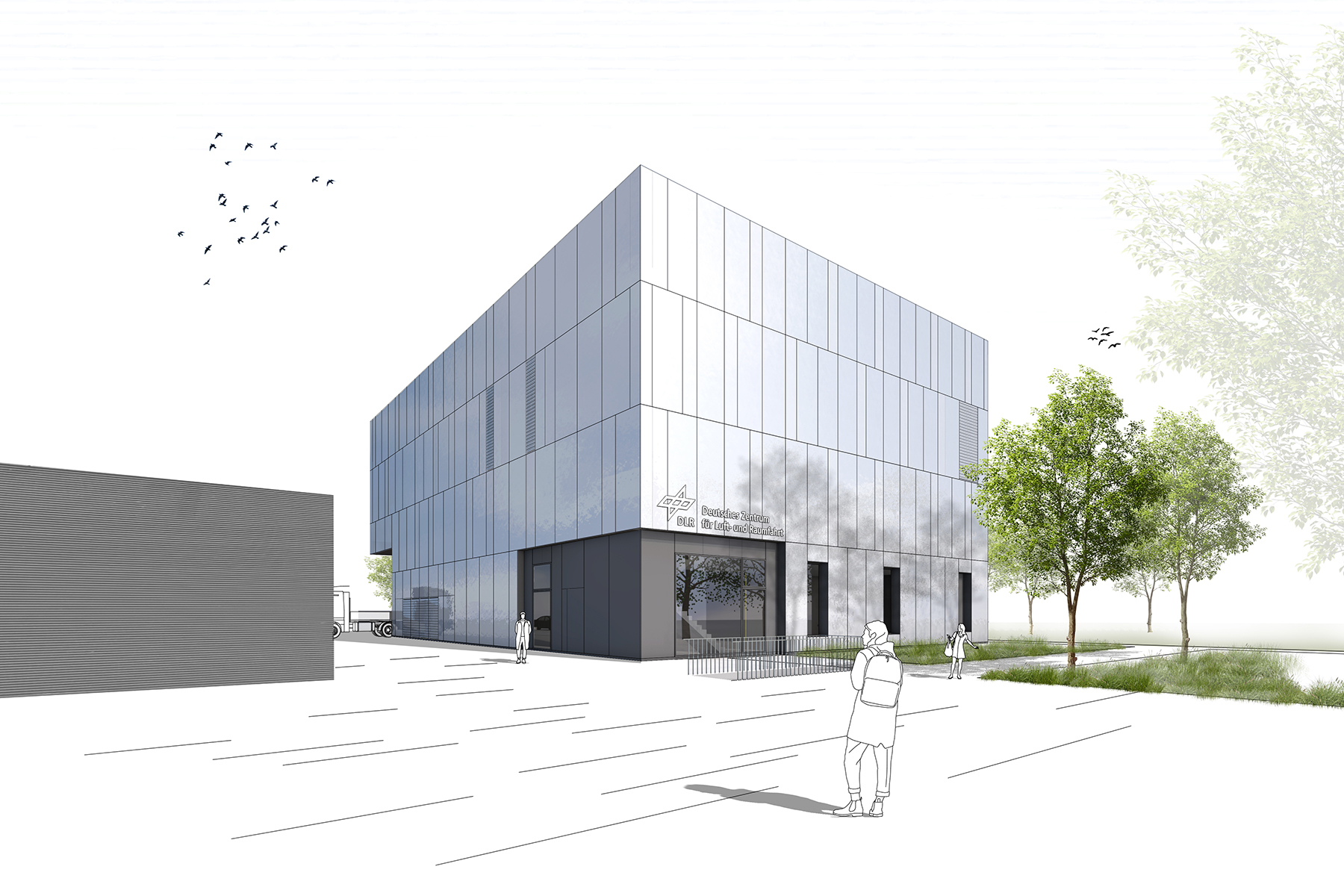 Der geplante Neubau ZDMG ist durch seinen Hauptbaukörper geprägt der direkt an den ersten Bauabschnitt MS-Gebäude angebaut und diesen in seiner Form und Materialität fortführt. Für die Bildung eines einheitlichen Ensembles erhält das zurückspringende Sockelgeschoss, wie auch im MS-Gebäude, eine einheitliche Putzfassade als Angleichung zu den Bestandsgebäuden der Trogerstraße. Ihrer besonderen Nutzung entsprechend erhalten die „öffentlichen Bereiche“ im Erdgeschoss des zweigeschossigen Sockelbaus großzügige Fensteröffnungen im Eingangsbereich sowie im Kommunikations- und Seminarraum. Eine Eckverglasung betont außerdem die Eingangssituation des Gebäudes.